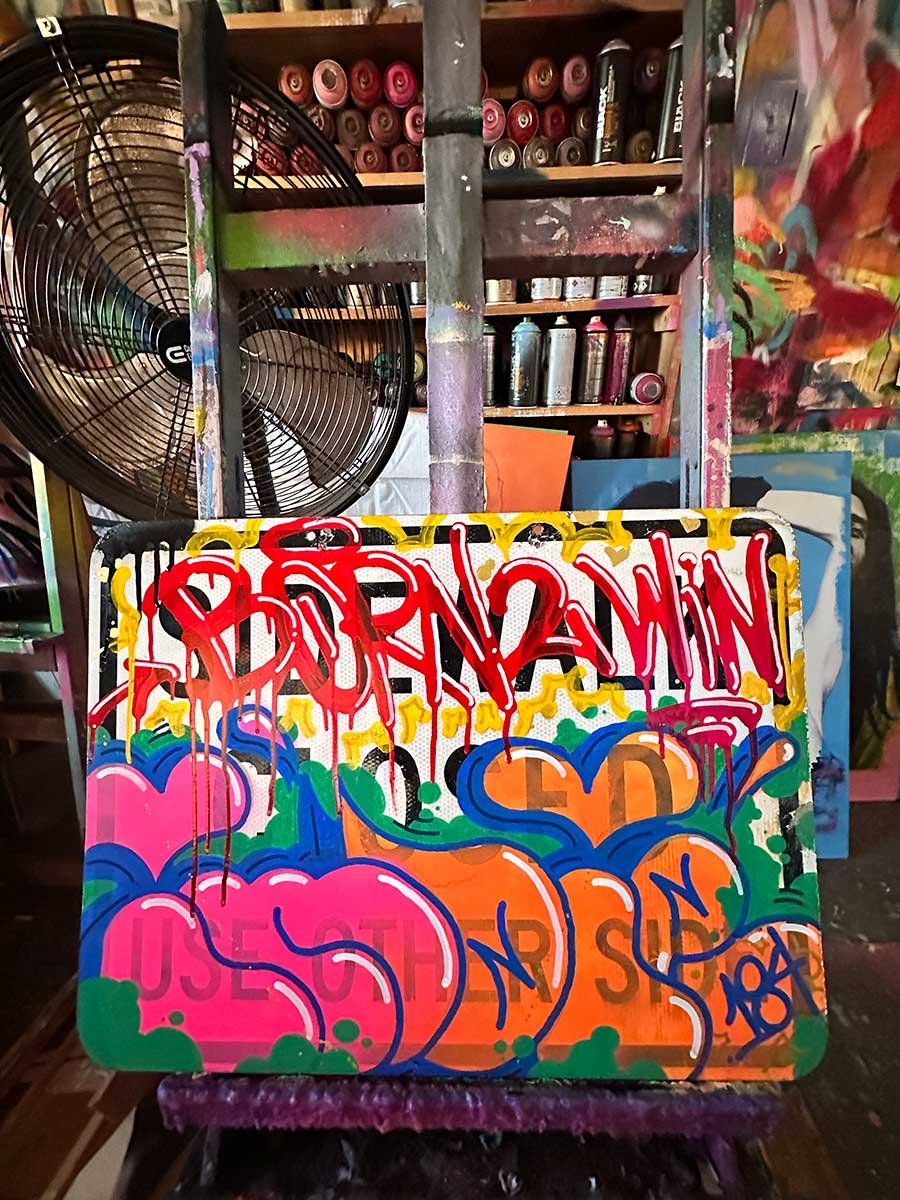 INDIE 184, “Born 2 Win”, 18x27 inches, enamel and acrylic on metal, 2026.